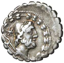 L. SCIPIO ASIAGENUS, (106 B.C.), silver denarius, Rome Mint, (3.86 g), obv. laureate head of ...