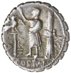 The moneyer is presumably a grandson of Sp.Postumius Albinus a Consul in 110 B.C. and probably the adoptive father of Crawford 450. The reverse alludes to civilian and military imperium. The obverse type is a reference to the Spanish command of L. Postumius Albinus a Praetor in 80 B.C. It also relates to the successful expeditions against the Vaccaei and Lusitani and the levying of troops for this campaign.