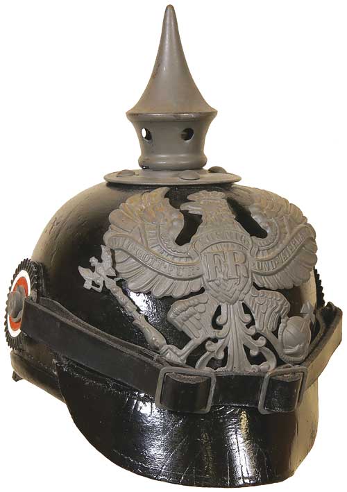 IMPERIAL GERMANY, Prussia Infantry enlisted ranks model 1915 pickelhaube, a completely refurbished composite parts example using the dome of an original leather body and front peak with a replaced reproduction rear neck guard, all with a high gloss repainted finish, reproduction chinstrap and state and national cockades, reproduction repainted helmet plate, with damage to the reverse and missing one lug, repainted field grey steel ersatz spike missing the front peak mount, reproduction leather liner. Fine.