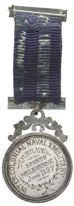 A military/naval sporting tournament was held over two days on 20 and 21 June 1887 to celebrate Queen Victoria's Golden Jubilee. The first events were staged on Monday night at the Exhibition Building and the next day's events at the Agricultural Society's Show Grounds near Flemington Racecourse. The first above medal was awarded to the NSW Naval Artillery Volunteers team which won first place in Naval Cutlass Drill and in Sword and Bayonet.
