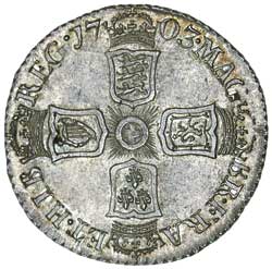 ANNE, before the Union, shilling, 1705 plumes (S.3588). Lightly toned, good very fine.