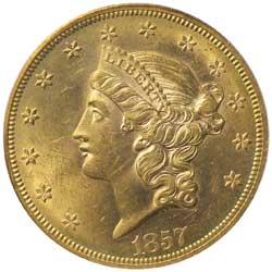 USA, TWENTY DOLLARS OR DOUBLE EAGLE, 1857S, Liberty head. Full mint bloom, uncirculated and rare thus.