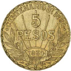 URUGUAY, Republic, five pesos, 1930, Artigas (KM.27). Nearly uncirculated.
