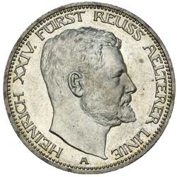 GERMANY, Reuss-Obergreiz, Heinrich XXIV, (1902-1918), silver three mark 1909A, (KM.130). Uncirculated, rare.