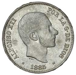 PHILIPPINES, Alfonso XII, fifty centimes, 1885 (KM.150). Underlying mint bloom, slight toning, nearly uncirculated.