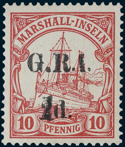 NEW GUINEA, surcharged stamps from Marshall Islands, 5mm apart for GRI and surcharge, 1d on 2d on 10pf. carmine, single example, (cf.SG 52), (not listed). MUH.