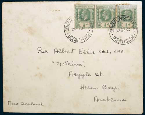 GILBERT AND ELLICE ISLANDS, envelope dated for 24 December 1933 and addressed to Sir Albert Ellis K.B.E., C.M.G. at Herne Bay, Auckland, New Zealand, with three George V halfpenny green Gilbert & Ellice Islands stamps across top right and these stamped with two clear post office cancellations, 'General Post Office Ocean Island 24DE38'. Aged with some foxing, used.