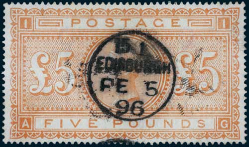 GREAT BRITAIN, 1882 high value issue with uncoloured letters in corners, white paper, wmk. large anchor, £5 orange Plate 1, SG 137 (CV £4,750), stamped Edinburgh, FE 5, 96. Used, very scarce.