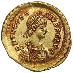 THEODOSIUS II, (A.D.402-450), gold tremissis, Constantinople mint, (1.51 g), obv. draped and cuirassed bust of ...