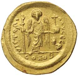 JUSTINIAN I, (527-565), gold solidus, 21mm, (4.42 g). Constantinople mint, 1st officina, issued 542-552. obv. helmeted and cuirassed bust facing, holding globus cruciger and shield, around DN IVSTINI NVS P P AVG, rev. angel standing facing, holding long staff terminating in staurogram and globus cruciger, star to right, around VICTORI A AVGGG A, in exergue CONOB, (S.140, DOC 9g, MIBE 7). Extremely fine, with mint bloom, very scarce.
