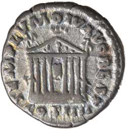 ANTONINUS PIUS, (A.D. 138-161), silver denarius, Rome mint, issued 158-9, (3.02 g), obv. ANTONINVS AVG PIVS P P, laureate head to right, rev. TEMPLVM DIV AVG REST, COS IIII in exergue, octastyle temple in which are seated two figures (Divvs Augustus and Livia) on podium, at top a facing quadriga, (S.4107, RIC 143, RSC 809) (illustrated); another, Rome mint, issued 144, (3.55 g), obv. around ANTONINVS AVG PIVS P P TR P COS III, laureate head to right, rev. around VIRTVS AVG, Virtus standing left, holding inverted spear and parazonium, (S.4138, RIC 102c, RSC 100, BMC 255). Toned, nearly very fine - very fine, scarce. (2)