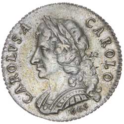CHARLES II, pattern farthing in silver, 1665, obv. CAROLVS A CAROLO, laureate and cuirassed bust ...
