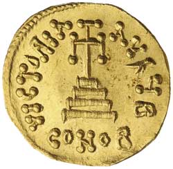 CONSTANS II, (641-668), gold solidus, Constantinople mint, 2nd officina, issued c.654-659, (4.35 g), obv. facing long bearded bust of Constans wearing chlamys and crown with cross on top, Constantine IV on right wearing crown, cross in field, around dN CONSTANTINUS C CONSTANTIN, rev. cross potent on base and three steps, below CONOB, around VICTORIA AVGUB, (S.959, DOC.27a, MIB 27, SB 961). As struck, with mint bloom, extremely fine.