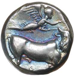 ITALY, Campania, Neapolis (Naples), (c.340-300 B.C.), silver nomos, stater or didrachm, (7.31 g), obv. head of nymph to right, monogram, X behind, rev. bull walking to right, crowned by Nike flying right, below **Q*, below on base line **[NEOPOLITWN]*, (cf.S.307, Sambon 476, SNG Cop.436, SNG ANS 369 [same dies], SNG Milan 123, BMC 69). Dumpy flan, very fine with attractive gold and blue toning.