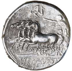 SICILY, Syracuse, Kingdom of, Agathokles, (317-289 B.C.), silver tetradrachm, (16.45 g), obv. head of Artemis-Arethusa to left, surrounded by three dolphins, with dotted border, trace of NK below, rev. galloping quadriga driven left by charioteer holding goad, above triskeles, in exergue **SURAKOSIWN over AN monogram, dotted border, (cf.S.971, BMC 350, SNG Lloyd 1478 (same dies), cf.SNG ANS 637, cf.SNG Lockett 1022). Uneven rough flan and slightly double struck on reverse, light grey tone, otherwise good very fine and very scarce.