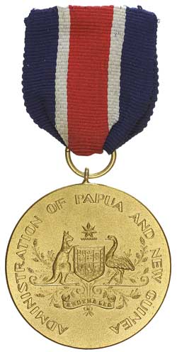 PAPUA NEW GUINEA, Loyal Service Medallion (Civil), type 2, 1953-72, in gilt bronze, struck by Stokes Australia, holed for suspension and with ribbon attached, reverse inscribed, 'CARRIER/TOKAINLA/A.N.G.A.U./BUNA/1943'. Extremely fine and scarce.