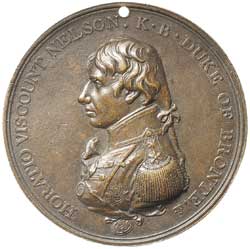 BOULTON'S TRAFALGAR MEDAL, in bronze, plain edge (48mm) by C.H.Kuchler, 19th century restrike, inscribed on reverse 'James Riley'. Holed at top for ring suspender, fine.