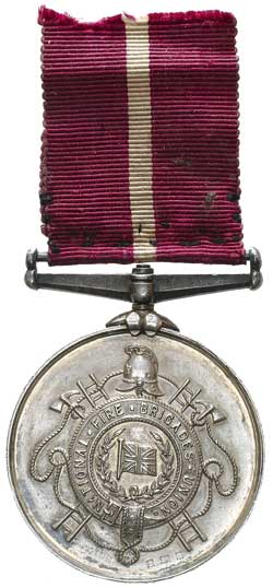 NATIONAL FIRE BRIGADES ASSOCIATION, Twenty Years' Long Service Medal in silver, at bottom of obverse is impressed for Birmingham 1906 by maker JRG&S (J.R.Gaunt & Son), reverse inscribed, 'Maidenhead/Fire Brigade./24 Years./1907.', edge numbered '57' and named to 'Fireman C.S.Lay B'. Ribbon poor, medal nearly extremely fine.