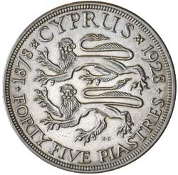 CYPRUS, George V, forty five piastres, 1928 (KM.19). Extremely fine.