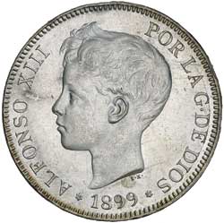 SPAIN, Alfonso XIII, five pesetas, 1899 (KM.707). Choice uncirculated.
