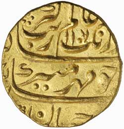 AURANGZEB, (A.H. 1068-1118, A.D.1658-1707), round gold mohur, (11.05 g), struck at Allahabad Mint, issued A.H. 1107 (A.D. 1695-1696), regnal year 40, obv. Aurangzeb name at top, rev. mint name at base on reverse, (KM.315.9). Good extremely fine, scarce.