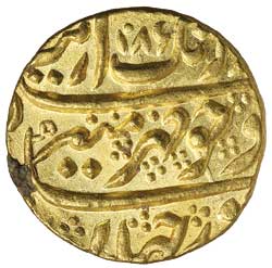 AURANGZEB, (A.H. 1068-1118, A.D.1658-1707), round gold mohur, (11.04 g), struck at Golkonda Mint, dated issue A.H. 1086 (A.D. 1675-1676), regnal year 30 (sic) both are not compatable, obv. Aurangzeb name at top, rev. mint name at bottom (off flan) on the reverse, (KM.315.18). As struck nearly uncirculated.