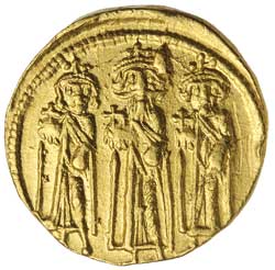 HERACLIUS, with Heraclius Constantine and Heraclonas, (610-641), gold solidus, (4.32 g), Constantinople mint, 5th officina, Dated IY 11 (637-8), obv. Heraclonas, Heraclius, and Heraclius Constantine standing facing, each wearing crown and chlamys and holding globus cruciger, rev. VICTORIA AVGUE around, Cross potent set on three steps, monograms flanking, in exergue CONOB. (S.764, DOC 39d, MIB 45). Nearly extremely fine, scratch in exergue, rare.