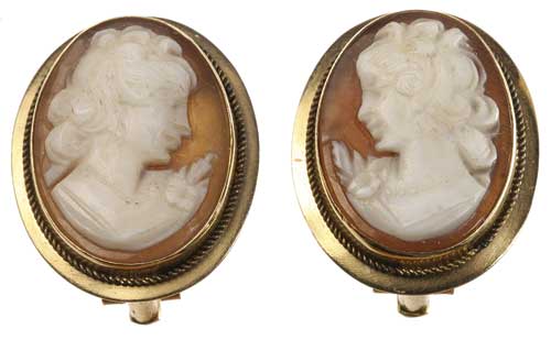 CAMEO EARRINGS, in 18ct gold (tot wt 4.96g), opposing bust of female in white on brown background bezel set into an oval frame seated on a larger base, suit unpierced ears. Very fine. (set of 2)