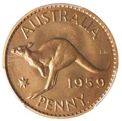 ELIZABETH II, Perth Mint proof penny, 1959. Full original mint red, FDC.