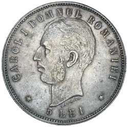 ROMANIA, Carol I, five lei, 1880B (KM.12). Extremely fine.