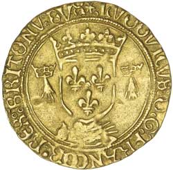 FRANCE, Louis XII le PŠre du Peuple (the Father of His People), (1498-1515), gold ecu d'or au soleil, (3.37 g), obv. crowned coat-of-arms, crowned ermine to left and right, star above, rev. voided short cross potent over cross fleuree, at centre, pellet in voided quadrilobe, crowned ermine in each angle, (Duplessy 649, Ciani 907, Fr.327). Very fine, scarce.
