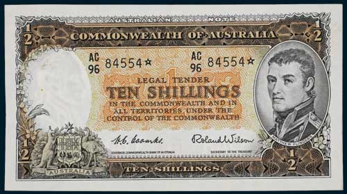 TEN SHILLINGS, Coombs/Wilson (1954) AC/96 84554* (R.16s). Good extremely fine and very rare thus.