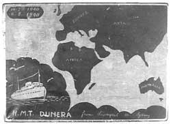 TOBACCO TIN (PLAYERS NAVY CUT, etched with H.M.T Dunera from Liverpool to Sydney 10.7.1940/ 6.9.1940 on top of lid and with camp scene on the base. Fine and very rare.