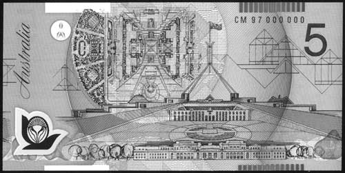 FIVE DOLLARS, Macfarlane/Evans (1996) specimen only issue CM97 000000 (From uncut sheet?). Uncirculated and very rare.