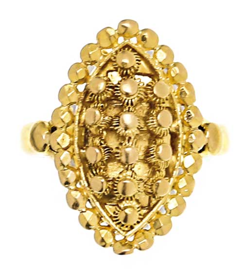 GOLD RING, oval in shape with a floral pattern fitted centrepiece, tested as at least 22ct gold (6.34g). Extremely fine.