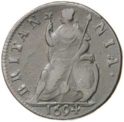 WILLIAM AND MARY, farthing, 1694 (S.3453). Dark tone, nearly very fine.