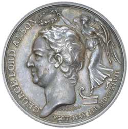 FRENCH FLEET DEFEATED OFF CAPE FINISTERE, 1747, in silver (43mm) (MH 345; Eimer 616), by T.Pingo, obverse, bust of Lord Anson left being crowned by Victory with her foot on the prow of a galley, reverse, Victory holding a wreath and trident and standing upon a sea monster, six laurel wreaths around with the names of the principal officers of Anson's ship, Centurion, on her world circumnavigation 1740-1744 (type with Campbel). Nicely toned, a few very minor edge nicks and a few marks in Anson's hair, otherwise extremely fine and rare.