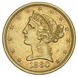 USA, FIVE DOLLARS OR HALF EAGLE, 1880, Liberty head. Nearly extremely fine.