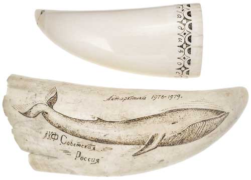 SCRIMSHAW, 20th century, two Russian examples, the first engraved with a large whale and the reverse depicting a snow sled scene, the second with lettering around the base, (165mm and 125mm long). Very fine. (2)