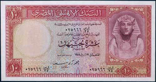EGYPT, Government, five piastres (1940)(P.164, 165a), ten piastres (P.167); National Bank of Egypt, twenty five piastres 4/9/42 (P.10c), 1955 (P.28); fifty piastres 5/6/39 (P.21a), 1960 (P.29); one pound 13/1/45 (P.222), 1961 (P.30); five pounds, 1956 (P.31); ten pounds, 1955 (P.32); Arab Republic, five (4) and ten (4) piastres, 1958-71 (P.176, 177). Very fine - uncirculated. (19)