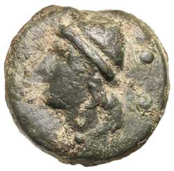REPUBLIC, Anonymous Series, (c.280-269 B.C.), AE cast sextans, (57.82 g), obv. Dioscuri head right in conical cap two pellets behind, rev. other Dioscuri head to left in conical cap two dots behind, (S.552, Cr.18/5, Syd.19). Green and brown toning, edge flaw from casting, usual rough surface, fine and very scarce.