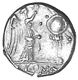 ANONYMOUS SERIES, (shortly after 211 B.C.), silver victoriatus, (3.222 grams), Rome mint, obv. laureate head of Jupiter to right, border of dots, rev. Victory to right, crowning trophy, in exergue ROMA, dotted border, (S.49, Cr.44/1 or 53/1, Syd. 83). Good very fine.