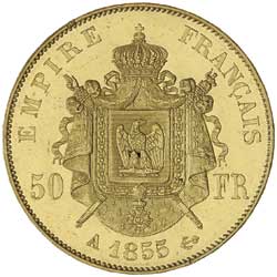 FRANCE, Napoleon III, fifty francs, 1855A (KM.785.1). Contact marks in fields, otherwise extremely fine.