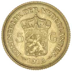 NETHERLANDS, Wilhelmina, five gulden, 1912 (KM.151). Good extremely fine.