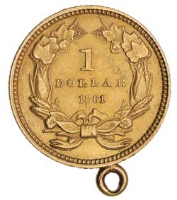 USA, GOLD DOLLAR, 1861, Indian Princes head. Small loop mount at top, otherwise good very fine.