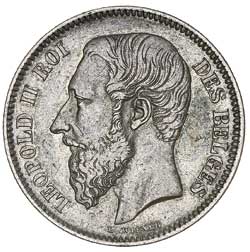 BELGIUM, Leopold I and II, two francs, 1880 (KM.39). Attractively toned, uncirculated and scarce thus. ...