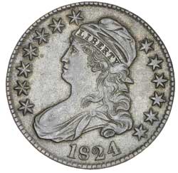 USA, CAPPED BUST HALF DOLLAR, 1824/4. Toned, nearly extremely fine.