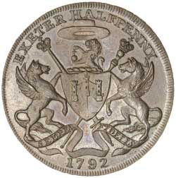 DEVON, Exeter halfpenny, 1792 (D&H.2). Red and brown, uncirculated.