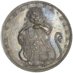 OLIVER CROMWELL, Lord Protector, 1653, cast and chased in silver (37mm) by Thomas Simon (15.66g), obv. Oliver Cromwell, Lord Protector, in an armoured and draped bust to left. rev. Lion holding arms of Cromwell and the Commonwealth (MIi,409/45; Lessen (1977) 114-26; Eimer 188). Toned extremely fine, rare.