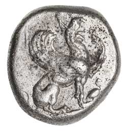 IONIA, Teos, (c. 510-500 B.C,), silver stater (11.92 g). obv. Griffin seated right, raising forepaw, swan before, rev. Quadripartite incuse square, (S.3512, Balcer group V [dies obverse A13 die, reverse P19 die], SNG Copenhagen 1437). Good very fine and rare.
